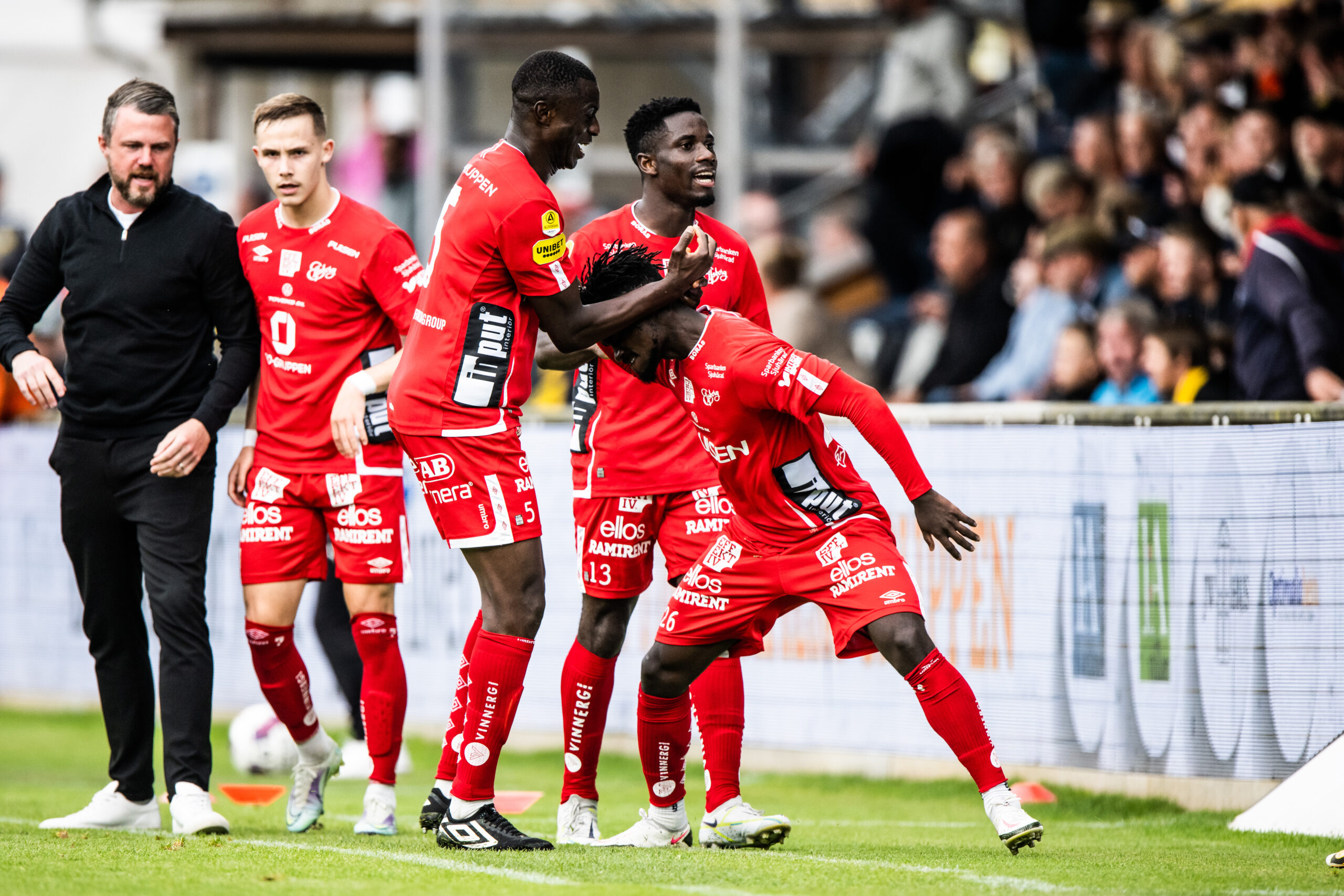 Startuppställning (4-3-3): Hakon Valdimarsson–Simon Strand, Sebastian Holmén, Maudo Jarjué, Niklas Hult–Noah Söderberg (68), Emmanuel Boateng, Michael Baidoo–Rasmus Alm (68), Sveinn Gudjohnsen (77), Jeppe Okkels (77)
